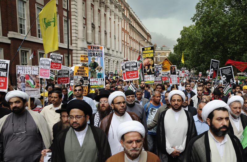 Britain recently proscribed the Iranian terrorist proxy organization, Hezbollah, under the UK Terrorism Act 2000. According to that law, membership of a proscribed terrorist organization is an offense, and so is supporting it, not just financially, but also voicing support and advocating for it, as well as publicly displaying the insignia or other articles of that organization, such as its flag. Pictured: The 2014 Al Quds Day march in London, England. A Hezbollah flag is held aloft at upper-right. (Photo by Dan Kitwood/Getty Images)