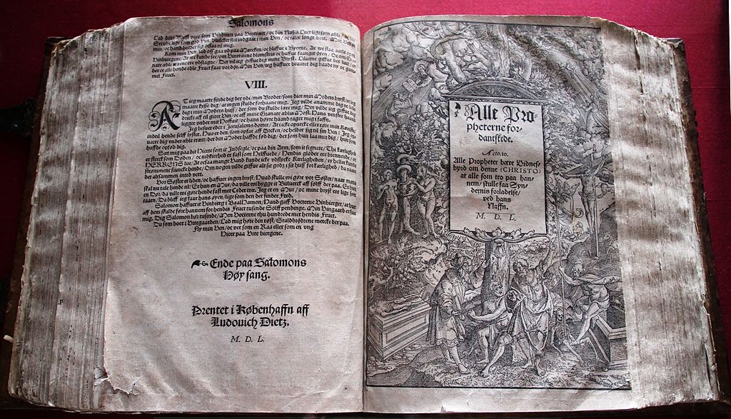 The Danish Bible Society's 2020 Bible translation is an assault on the faiths of both Jews and Christians, and an attack on the history of the Jewish State of Israel as well as on the Jewish people. Pictured: A copy of the first complete translation of the Christian Bible into Danish, printed in 1550 for King Christian III of Denmark, on display at Frederiksborg Castle, Denmark. (Image source: Bjoertvedt/Wikimedia Commons)