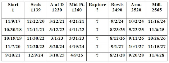 Where are we in the end times? Or in other words, at what point are we in an end times chronology? Are we near the beginning, near the middle, or near the end of the last 7 years before the Lord Jesus Christ returns to earth in bodily form? My answer: based on all I have observed and researched; we are either near the beginning of the last 7 years, or between the beginning and the midpoint, but definitely not near the end. Here is why I believe this to be the case. I believe that the first Seal of Revelation may have been opened—the white horse may be running throughout the earth right now. What happens as a result of the first Seal being opened? 1 And I saw when the Lamb opened one of the seals, and I heard, as it were the noise of thunder, one of the four beasts saying, Come and see. 2 And I saw, and behold a white horse: and he that sat on him had a bow; and a crown was given unto him: and he went forth conquering, and to conquer.Rev 6. It describes a power going forth to conquer—take over the world. Is this not what has been happening in relation to the coronavirus. The economies of the world are collapsing, unemployment is rising, and commodities are rising in price. Many believe this will give rise to a worldwide financial collapse that will usher in the New World Order government. In fact there may have been a sign in the heavens that Seal 1 has indeed been opened. The Rider on the White Horse was Given a Crown! Has Seal 1 Been Opened? I do not know for sure that Seal 1 has been opened, but if it has, then the Seal 2 Mid-East centered WW3 will be next. Followed by the Seal 3 worldwide financial collapse and then the Seal 4 death of 25% of the world population—1.9 billion. After these occur the New World Order will arise out of the ashes whose leadership will be given over to the antichrist. So if Seal 1 has been opened then Seal 2 is next and besides all the war rumblings we hear about from time to time, here is a possible confirmation that Seal 2 may be close at hand. An esoteric source based on 800-year-old sources uses precise methods to reveal a Torah code claiming that this month before the pandemic fades, war, involving the US, will break out between Saudi Arabia and Iran. This pan-global conflict will bring great strife and darkness into the world but through the darkness, the “candle of the Messiah” will be revealed. Source: 800-YEAR-OLD PROPHECY AND HIDDEN TORAH CODES: GOG AND MAGOG BEFORE PANDEMIC ENDS And if Seal 1 has been opened and we are nearing Seal 2 then that means that the 70thWeek—the last 7 years—has already begun. And in that regards since the last 7 years will begin 2520 days before Armageddon and since Armageddon is most likely to align with the Feast of Trumpets in a future year. That leads to the following possible timelines.