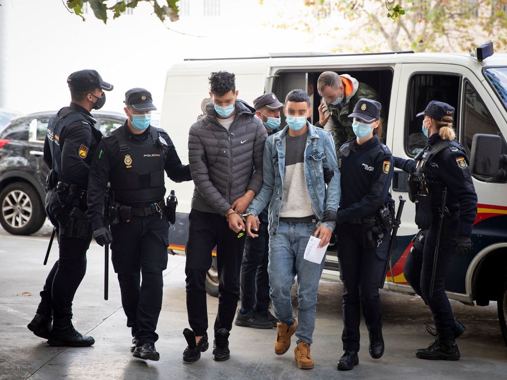 Prosecutors in Spain have charged a dozen North African migrants with sedition for illegally entering the country by forcing a commercial airliner to land on Spanish territory. Pictured: Two illegal migrants, who were part of the group that forced the airliner down, arrive escorted by police officers at the courthouse in Palma de Mallorca on November 8, 2021. (Photo by Jaime Reina/AFP via Getty Images)
