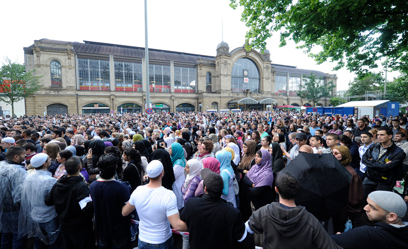 Pictured: Thousands of people listen as Salafist preacher Pierre Vogel speaks during a gathering of sympathizers on July 9, 2011 in Hamburg, Germany. (Photo by Christian Augustin/Getty Images)