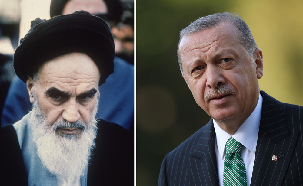 Iran's Ayatollah Ruhollah Khomeini (left) in 1978 and Turkey's President Recep Tayyip Erdogan in 2018. (Image sources: Khomeini - Hulton Archive/Getty Images; Erdogan - Sean Gallup/Getty Images)