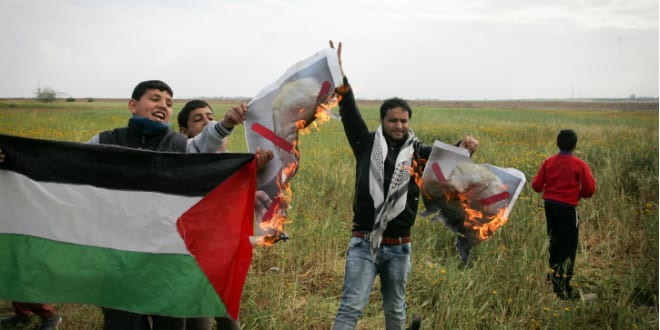 Palestinian rioters make their intention clear as they burn images and stage mock executions of the U.S. president