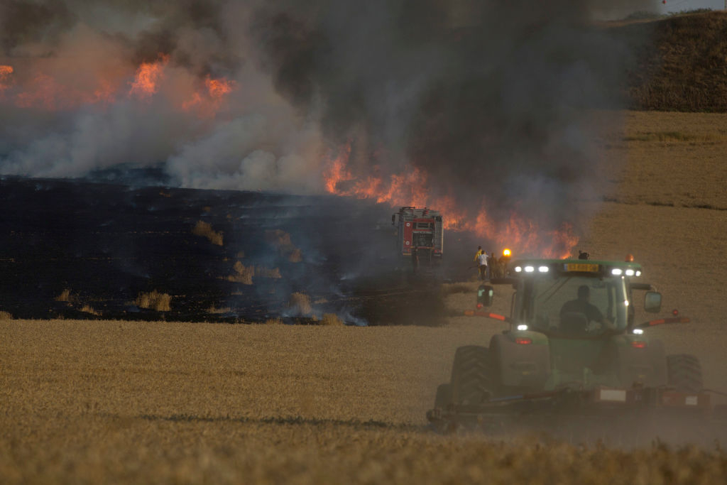 In the Hamas lexicon, launching arson kites at Israeli farms and villages near the border with the Gaza Strip is defined as "peaceful resistance." Pictured: Firefighters attempt to extinguish a burning wheat field in Nahal Oz, Israel, next to the border with Gaza after it was torched by an incendiary kite launched by Palestinians from the Gaza Strip, on May 15, 2018. (Image source: Lior Mizrahi/Getty Images)