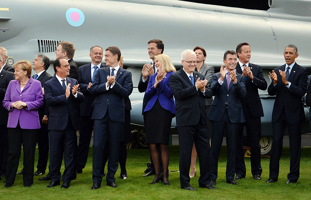 In 2014, at the Wales Summit, all NATO members pledged to meet a target of spending 2% of their GDP on defense by 2024. Five years later, only seven of the 29 NATO allies are currently reaching the agreed target of 2% of GDP. Pictured: Leaders of NATO member states watch a flypast of military aircraft at the NATO summit on September 5, 2014 in Newport, United Kingdom. (Photo by Stefan Rousseau/WPA Pool/Getty Images)
